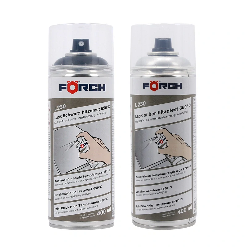 Černý žáruvzdorný lak Förch L230 je speciální lak na výfuky a výfukové koncovky, které dlouhodobě chrání před korozí a povětrnostními vlivy. Zároveň je odolný vůči benzínu i naftě. Díky odolnosti až do +650 °C je ideální na celý výfukový systém, trubky topení, kamna a další tepelně namáhané kovové díly.